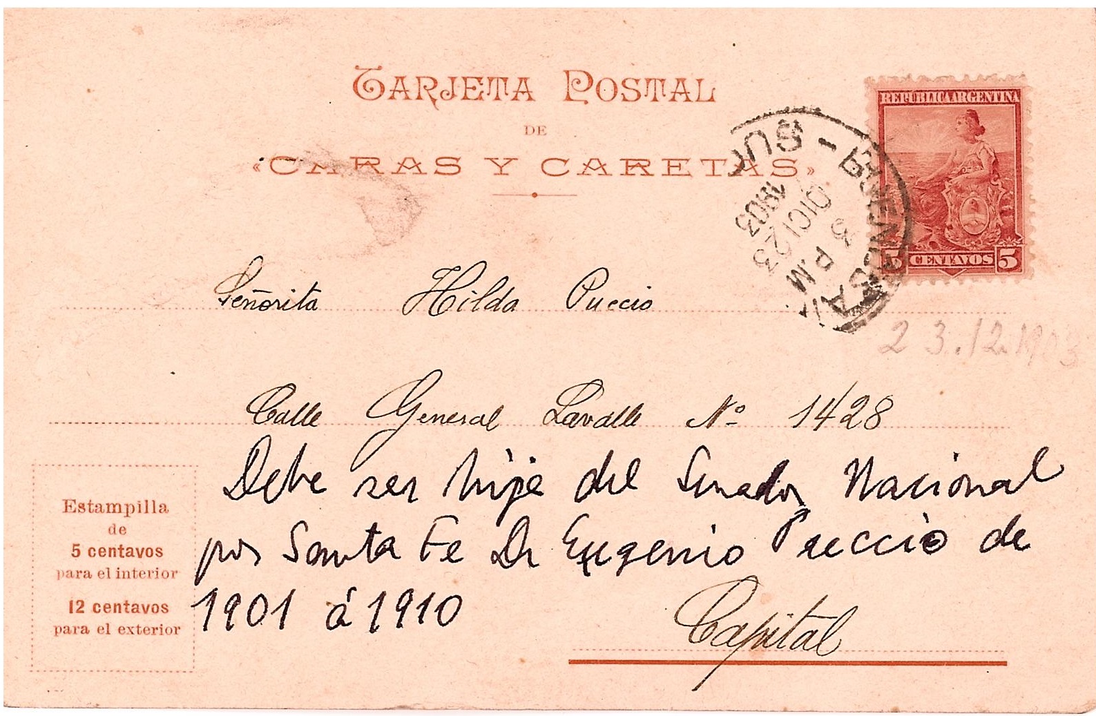 Tarjeta postal enviada por Ernesto Tornquist a la seƱorita Hilda Puccio, hija del senador nacional por Santa Fe, Dr. Eugenio Puccio (1900-1910)